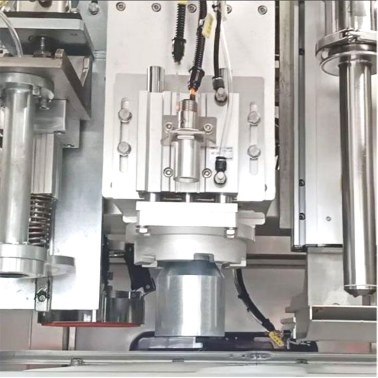 Pergala dagirtinê di jûreya dagirtinê de ye, û boriyek derzê ya VOC ya xwediyê derveyî ve girêdayî ye ku ew di rewşek zexta mîkro-neyînî de çêbike da ku ji revîna gaza eksê dûr bixe. Makîneya dagirtinê bi avahiyek serbixwe ya pergala serê çeka tijekirina materyalê ve tête stendine, li gorî rêwerzê ku dest bi her komek dagirtina çeka tijî bike, bi vî rengî fonksiyona dagirtina serbixwe ya bi tevahî bixweber pêk tîne. Ji bo her komek çeka dagirtinê û cîhaza tevgerê ya koordînasyona sazkirinê ya serê vebûn û zivirandinê, pergala vîzyona Almanî ya Basler ji bo pozîsyonê tête pejirandin. Pergala kontrolê dihêle ku çeka dagirtina diyarkirî bi rast bigihîje pozîsyona devê bermîlê li gorî pîvanên pozîsyonê yên devê bermîlê, û bixweber vebûn, dagirtin, dagirtina nîtrojenê û pêça zivirandinê temam dike. Çêlika xwarinê bi horîzontal ve tê danîn û ji hêla balanserê ve tê daliqandin da ku pêlêdana di tevgerê de kêm bike û jiyana kulmê baştir bike. Materyalên cihêreng hemî pergalên xweyên dagirtina serbixwe bikar tînin da ku pêşî li hevgirtinê bigirin. Û serê çeka dagirtin, çengê girêdanê û plakaya şilavê zû têne saz kirin, ku di lênihêrîna pêşerojê de jihevdexistinê hêsan dike.
